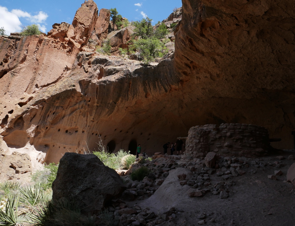 At the base of the canyon are the foundations of Big Kiva and the impressive Tyuonyi, a large circular pueblo built of stone blocks that once stood two to three stories tall and consisted of more than 400 compact rooms. The trail takes hikers through the ruins, the walls of which are only about six or seven stones high, and then up to a higher vantage point to allow for a better appreciation for Tyuonyi's size and shape. Nearby Talus House, fully reconstructed in the 1920s along the wall of the canyon, helps visitors envision how these structures appeared before they deteriorated.