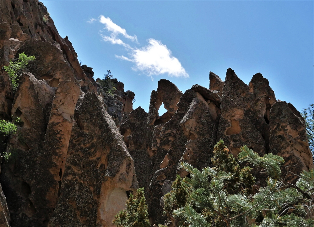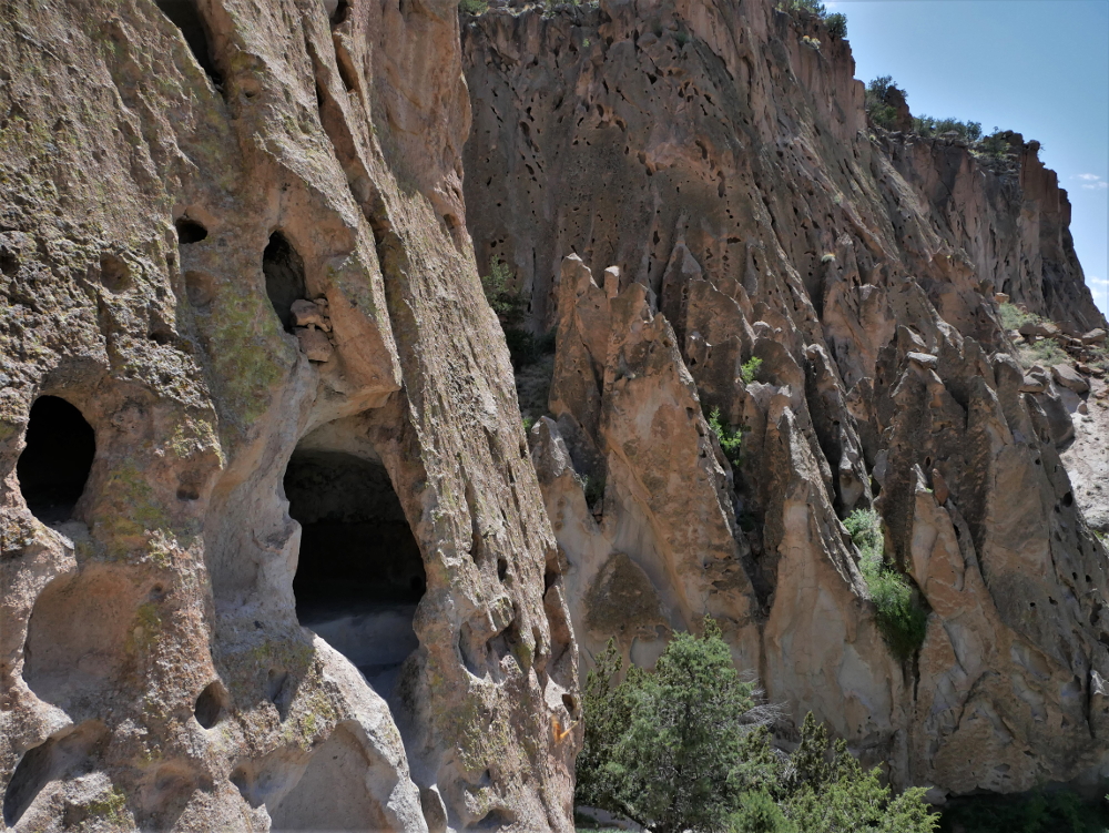 Within a short stretch of the 1.2-mile Main Loop trail, the evidence of a once-thriving community is unmistakable, yet the many dwellings and ruins blend in with the land without detracting from the natural beauty of this serene setting. A rugged coating of tan and white tuff (compressed volcanic ash) covers the canyon walls and is perforated with holes ranging from a few inches to a few feet in diameter. The largest holes are man made, carved out of the tuff that is the result of an eruption of the nearby Valles Caldera volcano more than 1 million years ago. Wooden ladders leading into these small dwellings allow visitors to climb inside to take in the view the Ancient Puebloans had hundreds of years ago.