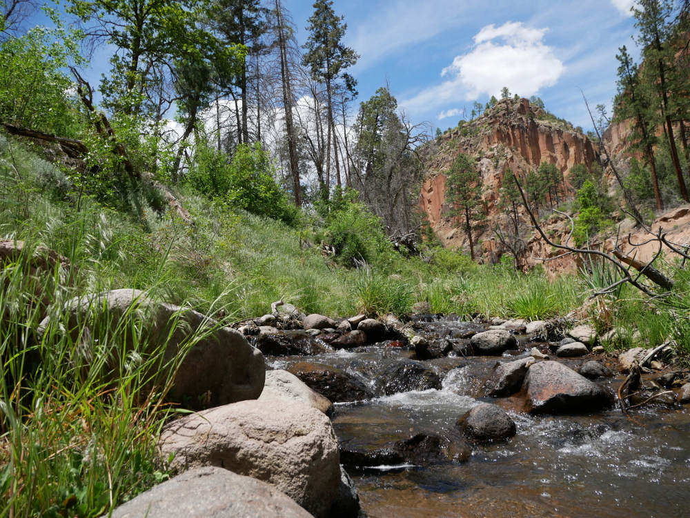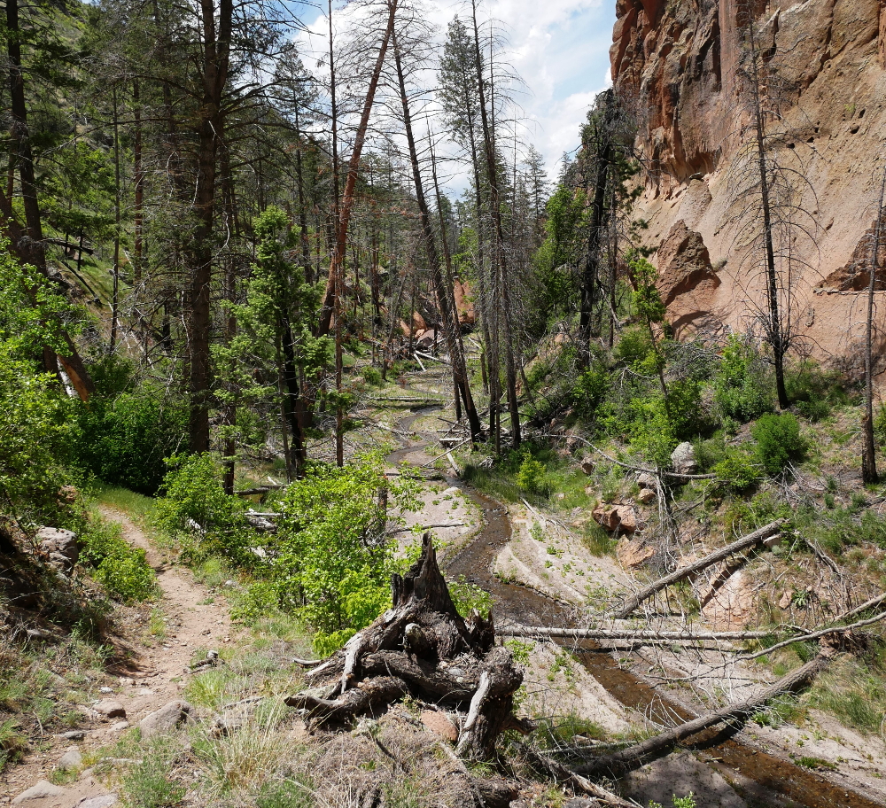 No two sections of the canyon appear the same. There's always some sort of crazy rock formation popping out of a cliff face or a cave or tent rock to compete for your attention. You'll also see dramatic evidence of the Las Conchas Fire, with charred trees and fallen, burnt logs scattered all about. Seventy-five percent of Frijoles Canyon was within the fire's footprint as the 2011 blaze burned an area of more than 150,000 acres. The area has been more prone to flooding due to the drastic reduction of plant life, but small shrubs and trees are popping up to provide splashes of green around the scorched remains.